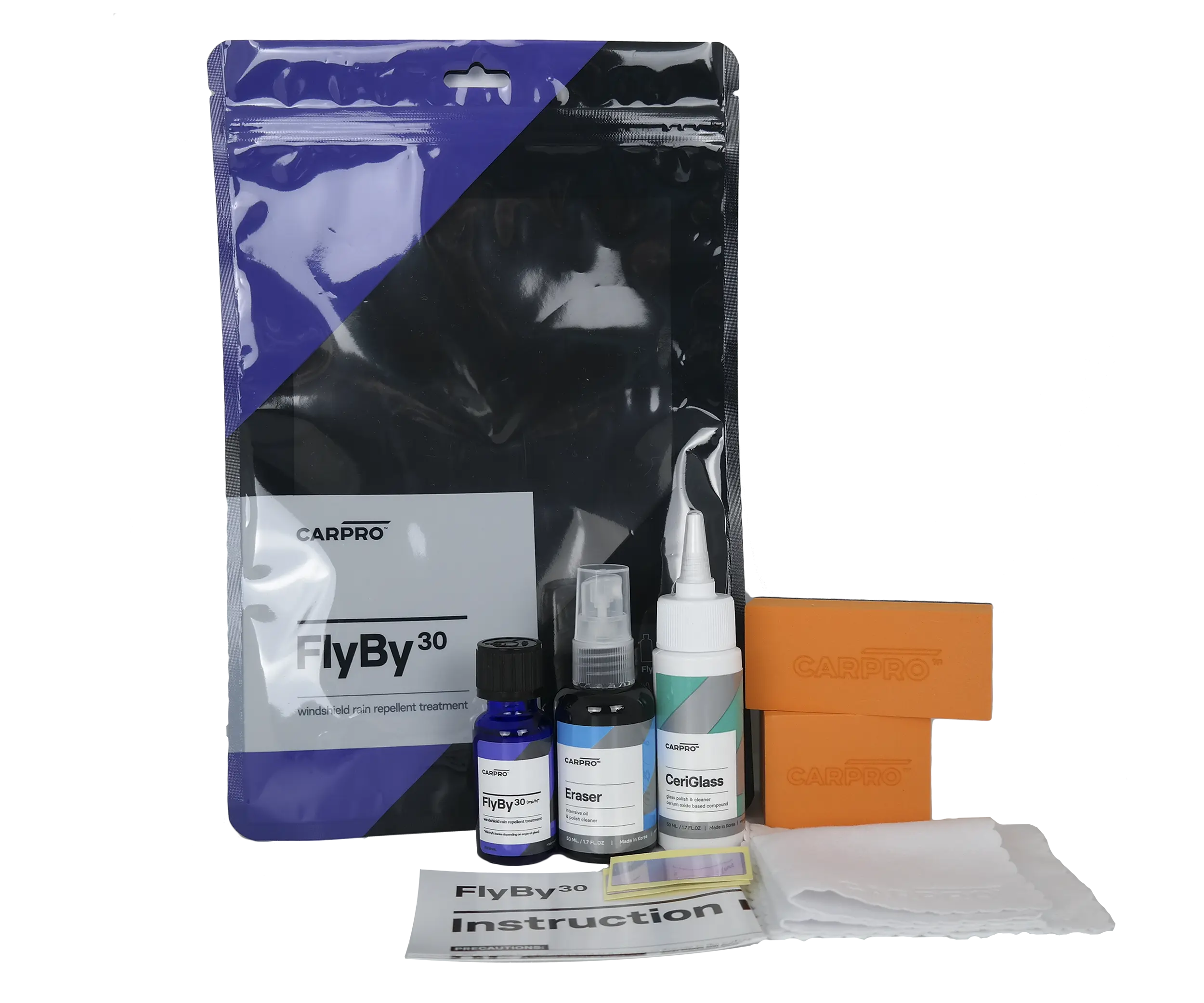 Kasutusjuhised: Ärge kandke märjale esiklaasile, see võib pinnale kahju tekitada. Poleerige klaasi kasutades Ceriglassi või värvipuhastit käsitsi või masinaga. Kui on kriimustusi, kasutage masinat. Pühkige jääkide eemaldamiseks. Puhastage pind põhjalikult Eraseriga. Loksutage FlyBy30, seejärel niisutage kaasasolevat aplikaatorit piisavalt, et see ei tunduks pealekandmisel kleepuv. Kandke esiklaasi või ühe akna ühele küljele ristmustriga. Kandke vajadusel aplikaatorile rohkem toodet, et vältida aplikaatori tõmbamist või kleepuvust. Laske umbes 1–3 minutit (temperatuuride ja niiskusest sõltuvalt) vilkuda ja uduneda, seejärel pühkige ära CARPRO 2Face lapi või kvaliteetse mikrokiudlapiga. Puhastage klaasipuhasti põhjalikult ja kandke Reload, et vältida labade kolisemist. Näpunäited: Soovitame: esiklaasile kanda 2–3 kihti ja teistele akendele 1 kiht. Järjestikused kihid võib kanda kohe. Seda saab hooldada Dr. Beasley’s AdvanceCoat: Glass või CARPRO Reload abil. Selle kattekihi riiulielu on umbes 12–14 kuud avamata ja 6 kuud või vähem avatuna.