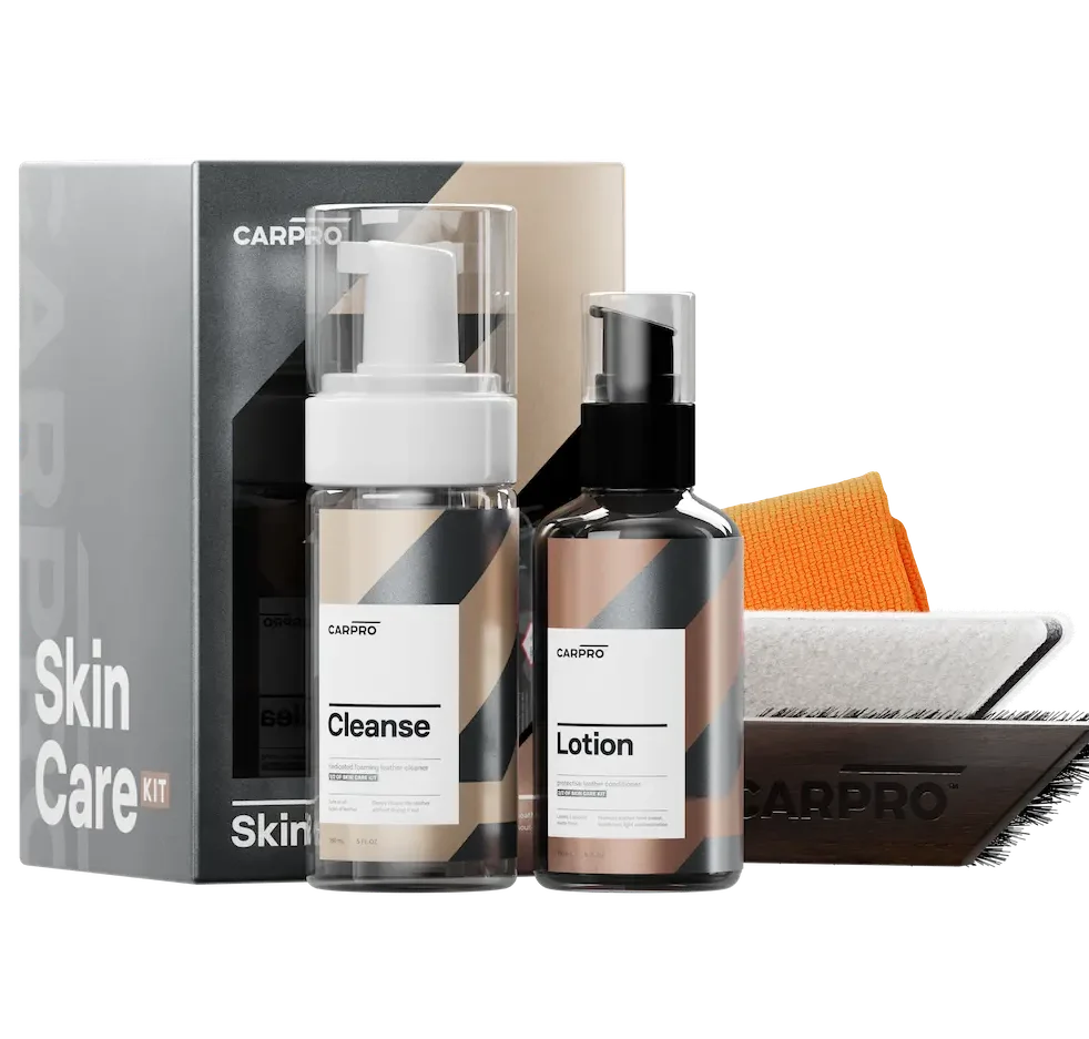 CARPRO nahahoolduskomplekt Nõuetekohane hooldus hoiab teie auto naha parimas seisukorras ja hoiab ära selle enneaegse kulumise. CARPRO Leather SkinCare KIT sisaldab kõike, mida autohoolduse entusiast vajab viimistletud nahkpindade töötlemiseks ja korrapäraseks hooldamiseks nende välimust muutmata. Naha määrdumine kahandab viimistletud naha pealiskihti ja võib põhjustada naha enneaegset riknemist. CARPRO Cleanse nahapuhastusvahend, mida kasutatakse koos CARPRO Leather harjaga, puhastab õrnalt ja tõhusalt naha pinna, et valmistada see ette konditsioneerimiseks. UV-kahjustused võivad põhjustada naha pleekimist ja kuivatamist, mis põhjustab pragunemist. CARPRO MicroBuff aplikaatoriga peale kantud CARPRO Lotion Leather Conditioner taastab pehme ja sileda tunde, kaitstes samal ajal UV-kahjustuste eest ega mõjuta selle loomulikku välimust.